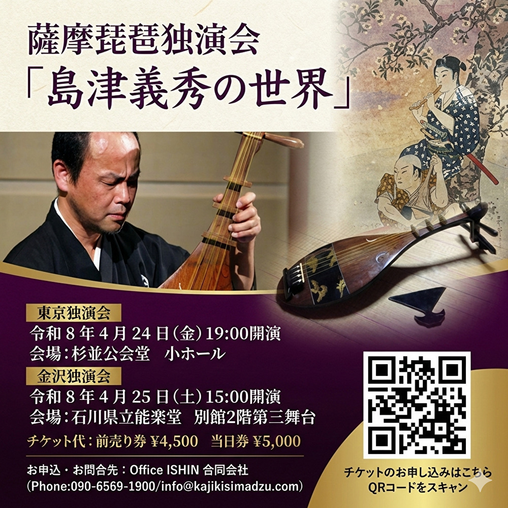 令和8年(2026年)4月、東京と金沢の2都市にて開催される薩摩琵琶独演会「島津義秀の世界」。